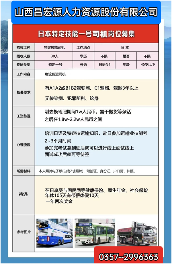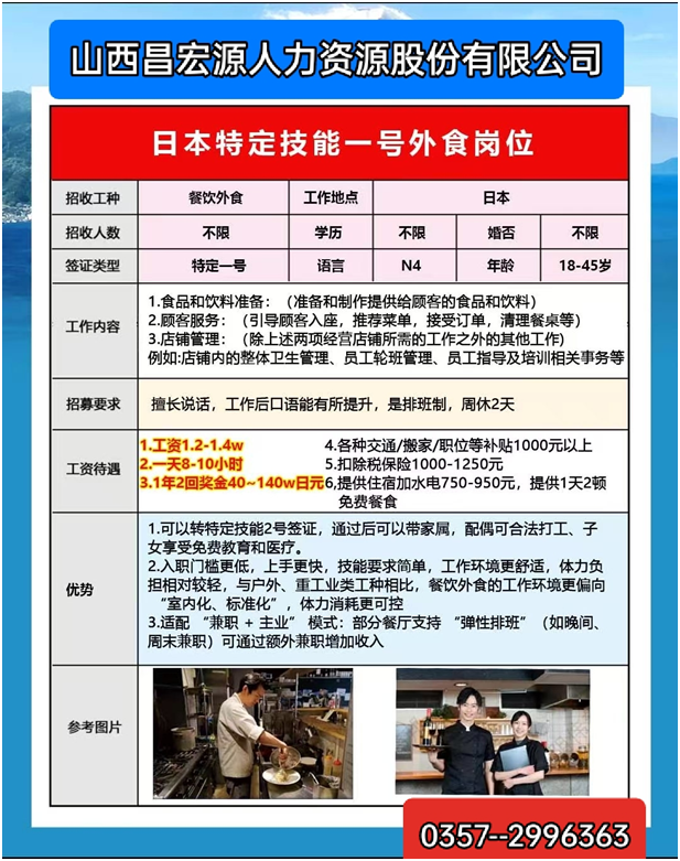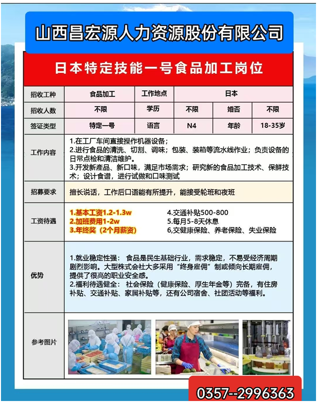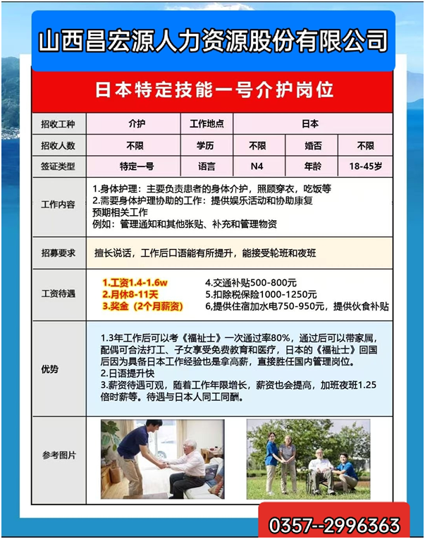 想通过赴日工作涨薪,却卡在3个问题:① 怕日语不好找不到工作 ② 担心公司不正规被骗 ③ 不知道自己适合哪种签证……”以上问题不要担心山西昌宏源人力资源股份有限公司顺应临汾市市场需求,为赴日、德就业人员提供专属服务啦!↓↓↓