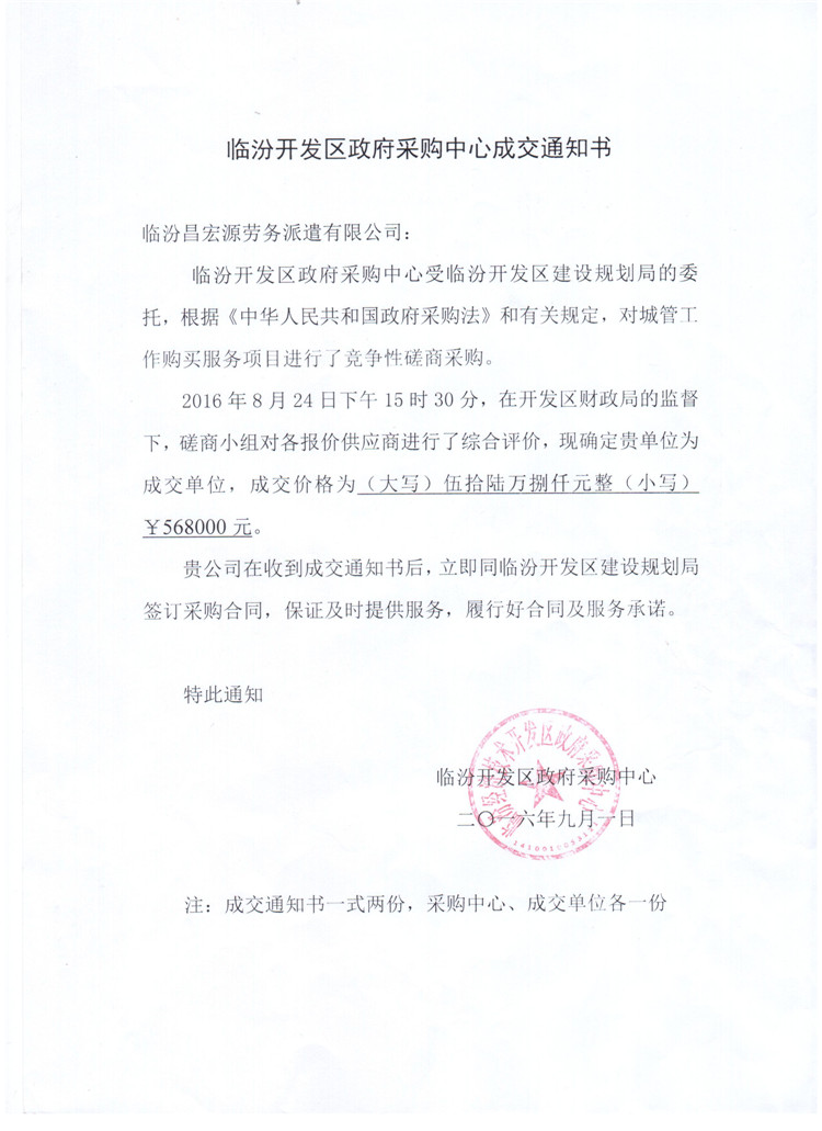 热烈祝贺!临汾昌宏源劳务派遣有限公司2016年8月24日在临汾开发区建设规划局服务项目中成功中标。